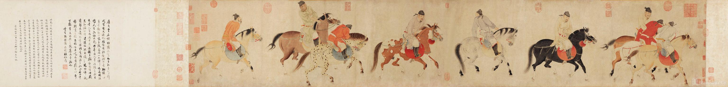 任仁發(fā)(1255—1327)是元代水利家,亦是該朝畫(huà)壇巨匠,其畫(huà)馬成就堪與同時(shí)代的趙孟頫(1254—1322)媲美?!段逋踝須w圖》是其筆下罕見(jiàn)的紙本作品,宋箋紙質(zhì)細(xì)密,包漿良好,色彩明亮;用筆輕松自然,整幅線條勾勒凝練瀟灑,人馬排列為平鋪式構(gòu)圖,是唐人造型和元人用筆之結(jié)合。
